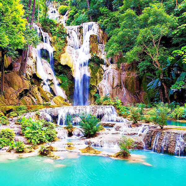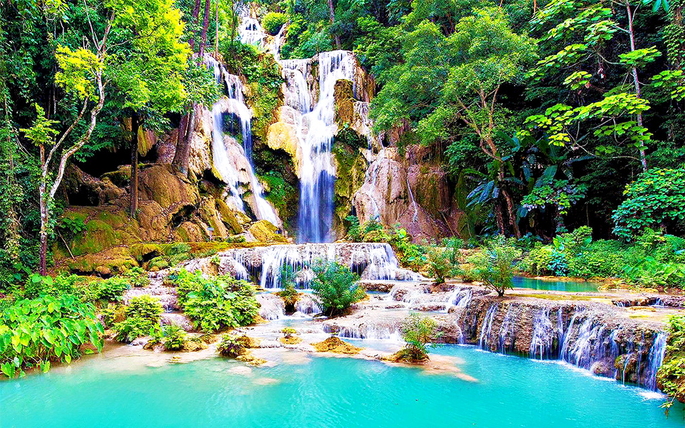 - Khu du lịch thác Kuang Si – Thác nước đẹp bậc nhất của xứ Thượng Lào, cao 120m với làn nước xanh ngọc bích. Quý khách tự do check-in quang cảnh rừng núi Thượng Lào và vui chơi tắm suối.